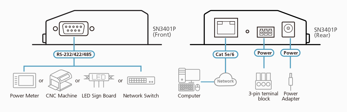 SN3401P, bezpieczny serwer urządzenia szeregowego (Secure Device Server) jest zewnętrznym urządzeniem sieciowym opartym na protokole IP, które bezpiecznie łączy starsze urządzenia szeregowe RS-232/422/485 z siecią Ethernet w celu uzyskania do nich zdalnego dostępu z komputera znajdującego się w dowolnym miejscu, co pozwala użytkownikom rozszerzyć liczbę portów szeregowych dla dowolnego komputera głównego w sieci.