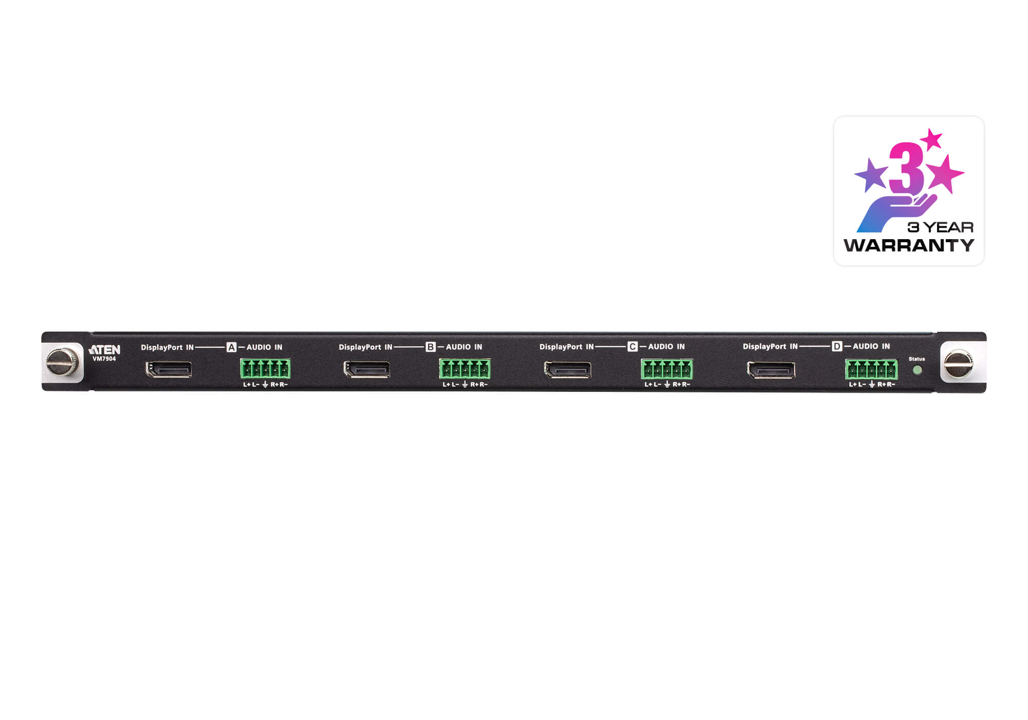 VM7904 to płyta wejściowa 4K DisplayPort , która współpracuje z modułem ATEN Modular Matrix Switch, aby zapewnić łatwy dostęp do 4 źródeł wideo i audio DisplayPort do 16 lub 32 wyświetlaczy. Oprócz interfejsu DisplayPort, który przenosi cyfrowy sygnał A / V, VM7904 zapewnia również 4 wejścia audio stereo, które umożliwiają niezależne kierowanie dźwięku stereo lub osadzanie go na wyjściu cyfrowym.