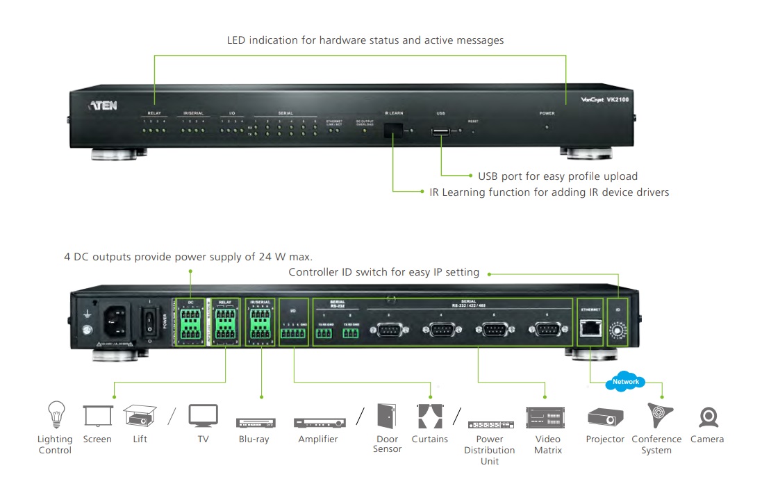 Urządzenie VK2100 można z łatwością połączyć z istniejącą siecią i łatwo zintegrować z produktami ATEN VanCryst pro-A/V oraz kompletną linią urządzeń, w tym sprzętu A/V, systemów oświetlenia, klimatyzacji, czujników ruchu, przełączników zasilania i wielu innych. Urządzenie VK2100 pracuje jako scentralizowana platforma, za pomocą której można monitorować, zarządzań i bezpośrednio kontrolować urządzenia za pomocą dostosowanego interfejsu użytkownika z poziomu urządzenia iPad.