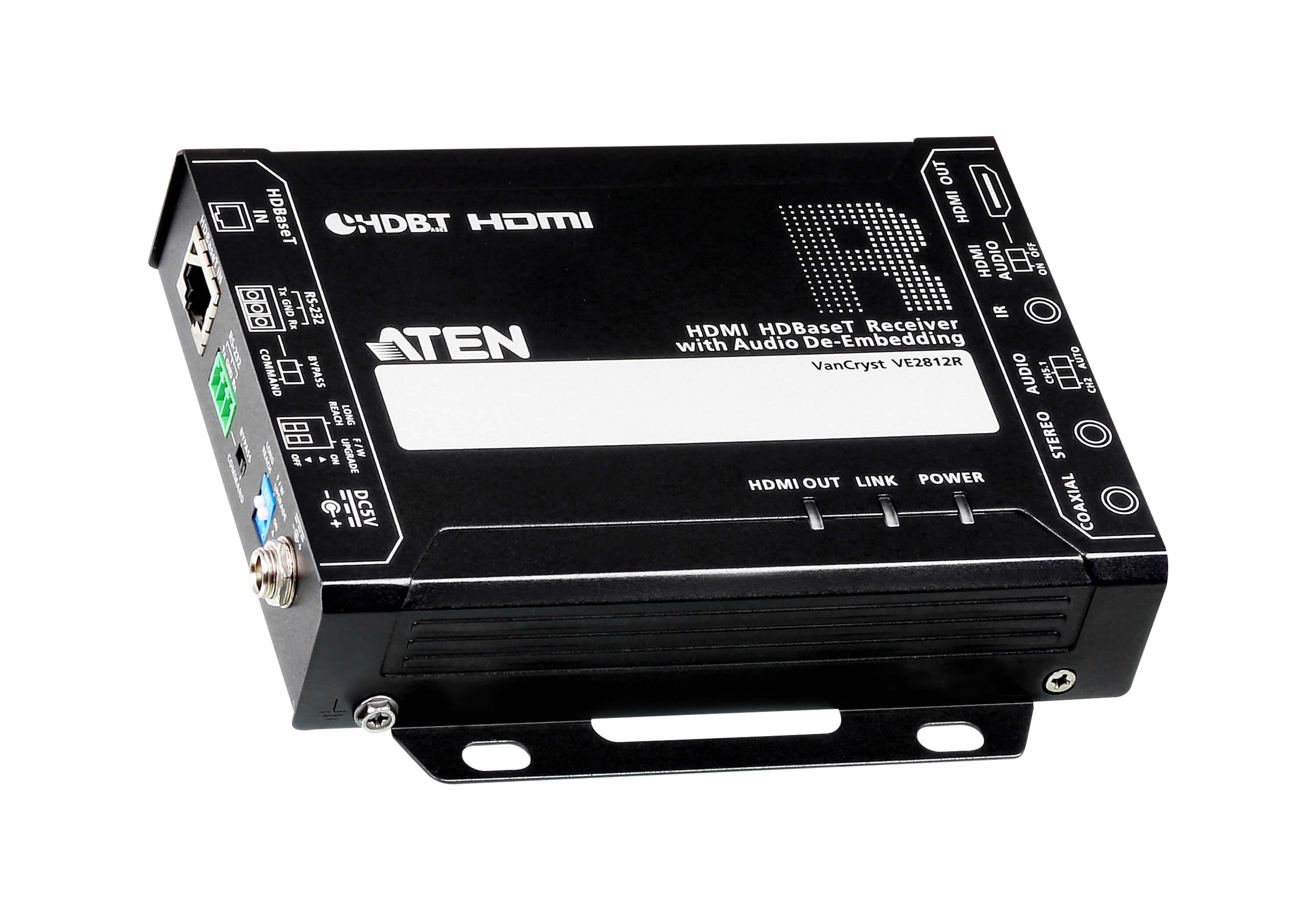 VE2812R to wysokiej jakości odbiornik HDBaseT HDMI z funkcją wyodrębniania dźwięku (audio de-embedding). Korzystając z technologii HDBaseT™, urządzenie VE2812R może odbierać sygnały HDMI 4K o zasięgu do 100 m na pojedynczym przewodzie Cat 5e/6/6a lub ATEN 2L-2910 Cat 6. Po włączeniu trybu HDBaseT Long Reach Mode urządzenie to może przesyłać sygnały HDMI o zasięgu do 150 m przy rozdzielczości 1080p.