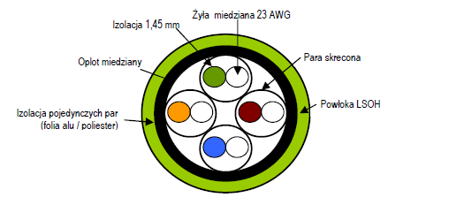 - Każda para oddzielnie ekranowana w aluminiowo poliestrowej folii (PIMF)