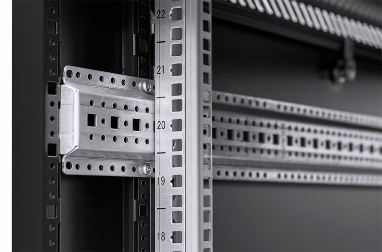 - 4 regulowane ocynkowane profile montażowe z zaznaczoną numeracją co 1U